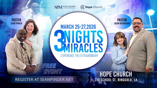 3 NIGHTS OF MIRACLES – March 25-27 in Ringgold, Louisiana at Hope Church with Pastors Jason and Annalichia Boudreaux. I'm telling you, God is going to move powerfully! Healings, deliverances, salvations, miracles, and breakthroughs will be released. Lives will be transformed. Don't miss this divine appointment. Register for FREE at seanpinder.net/register. God will not disappoint your faith!